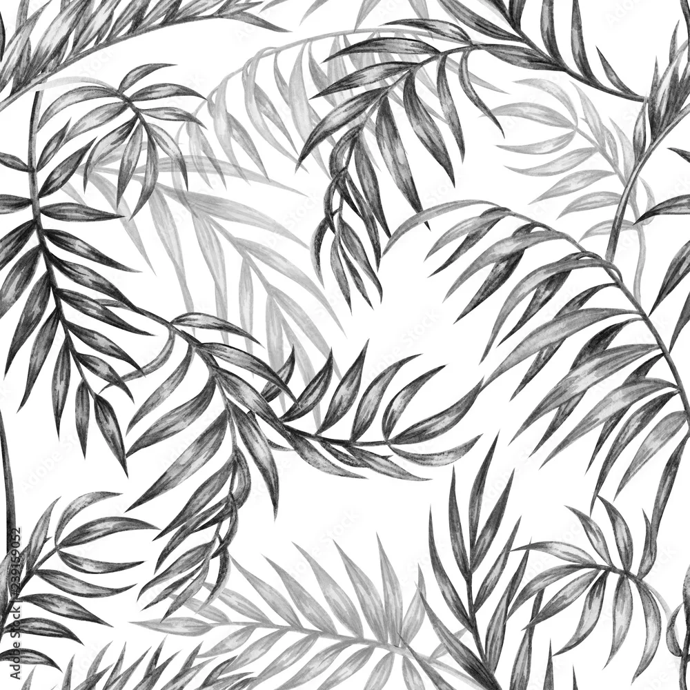 Tapety Bezszwowy czarny i biały wzór palmowi liście, tropikalny tło, ręka rysunek