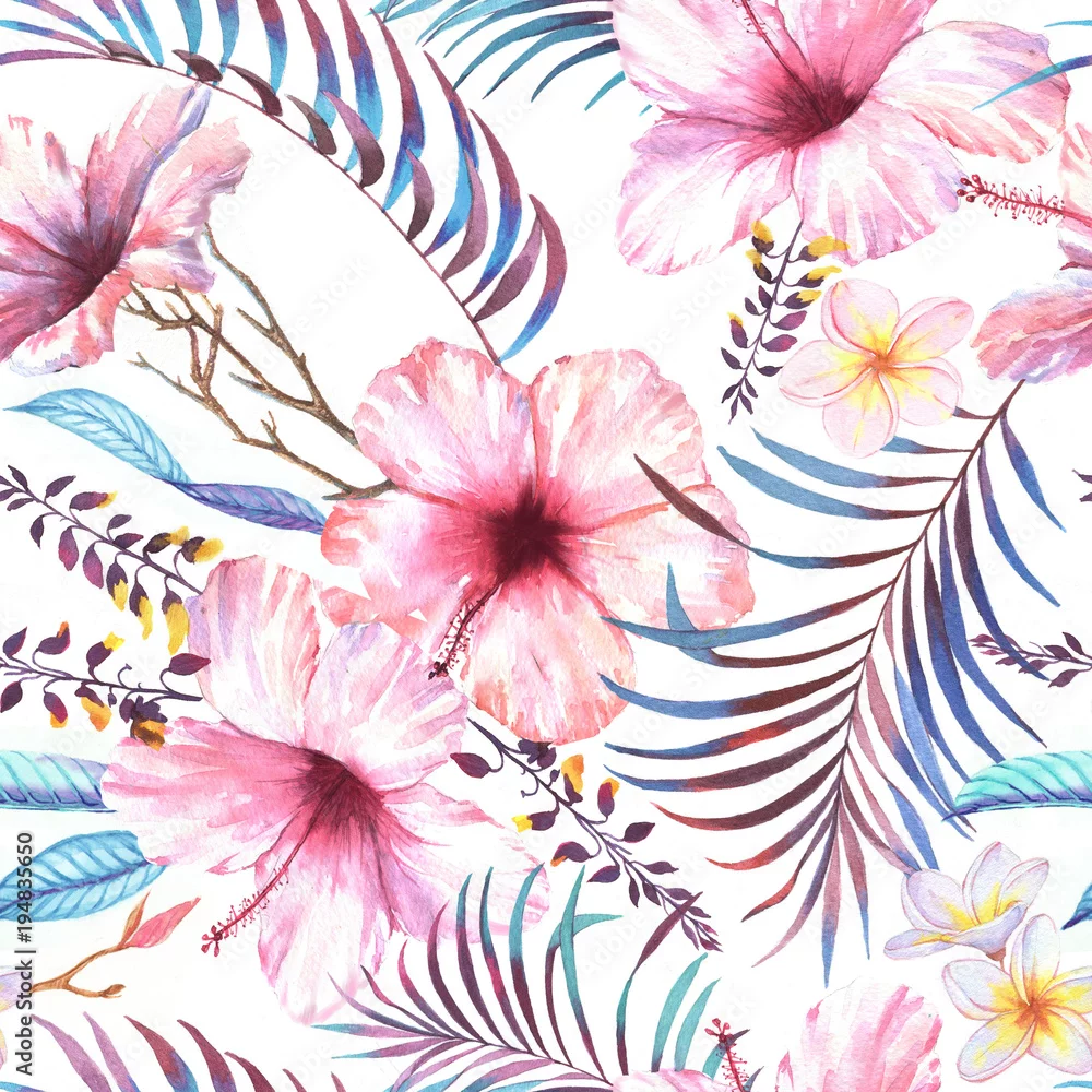 Tapety Ręcznie rysowane kolorowy wzór z akwarela liści palmowych, egzotycznych roślin i kwiatów hibiskusa. Lato powtarzające się tło