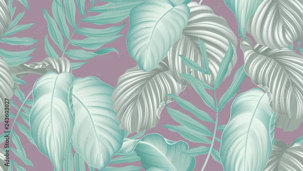 Tapety Tropikalny wzór bez szwu, zielony Dypsis lutescens lub żółta palma, tępak i zielone liście Calathea orbifolia na fioletowym tle, pastelowy styl vintage