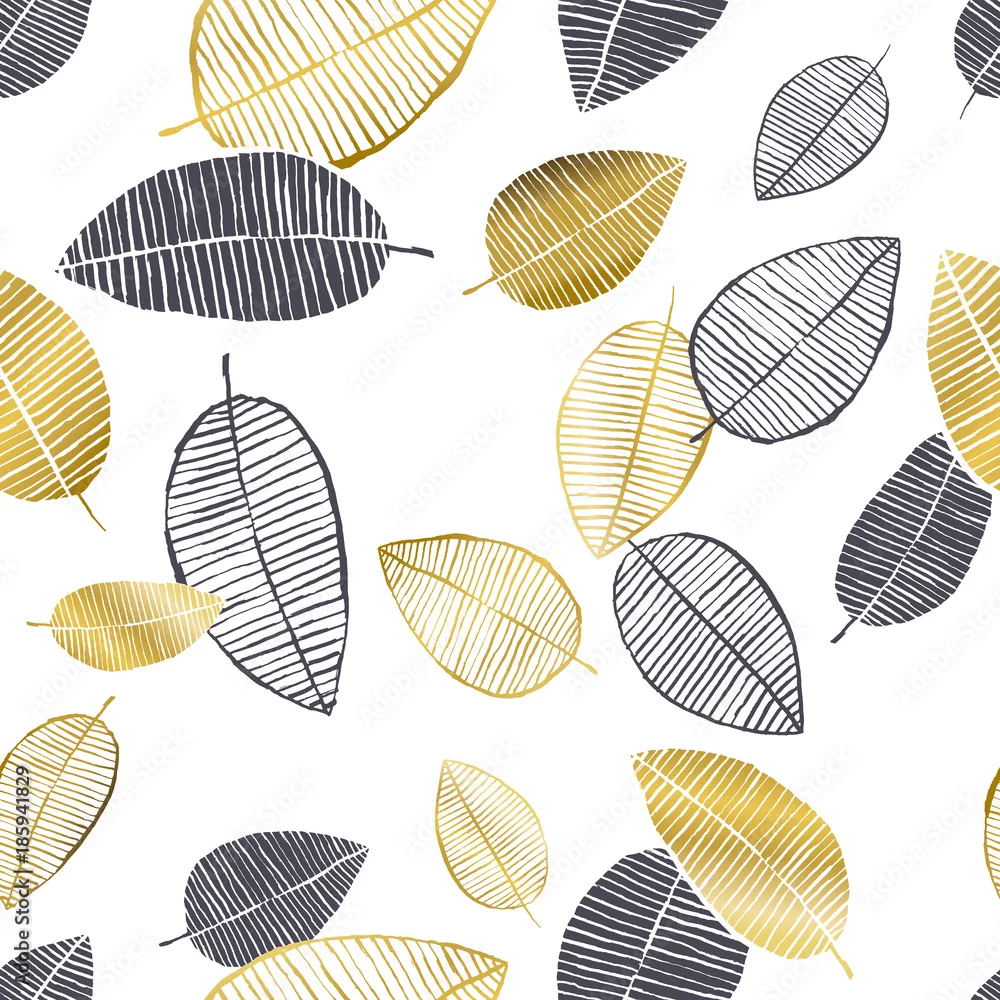 Tapety Wektorowy bezszwowy wzór z ręka rysującymi złotymi, czarnymi, białymi akwareli i atramentu liśćmi. Modny skandynawski design