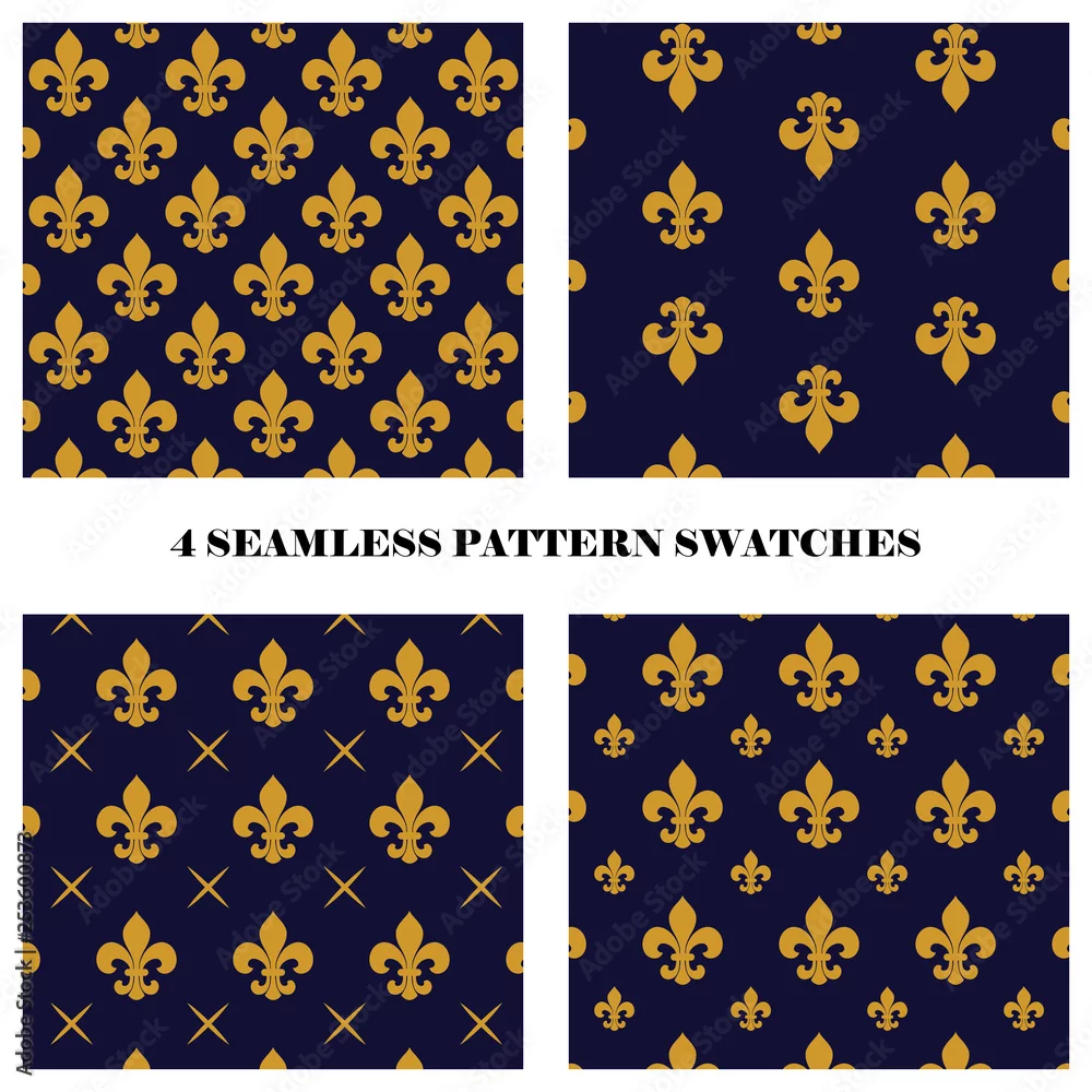 Tapety Vector set of 4 fluer de lis seamless repeat pattern swatches in dark blue and yellow colors. Textile design. - lisy - Picturewall.pl