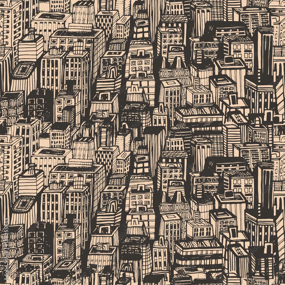 Tapety Ręcznie rysowane wzór gazety Vintage design z wielkim miastem. Ilustracja wektorowa z architektury NYC, wieżowce, megapolis, budynki, centrum miasta.