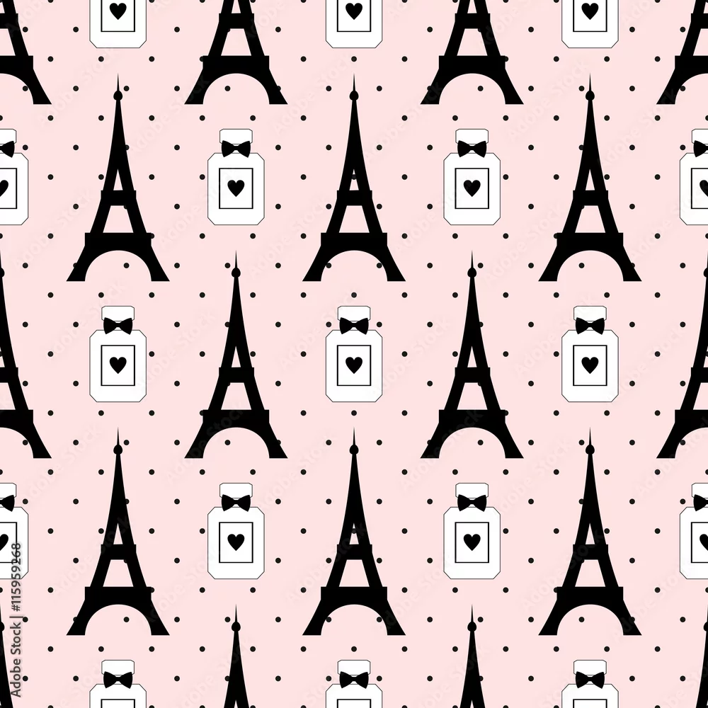 Tapety Śliczna kreskówki wycieczka turysyczna Eiffel z pachnidło butelki wektorową ilustracją na różowym polki kropki tle. Wzór symboli Paryża. Romantyczna podróż po Paryżu. Projektowanie tkanin, tkanin i dekoracji.