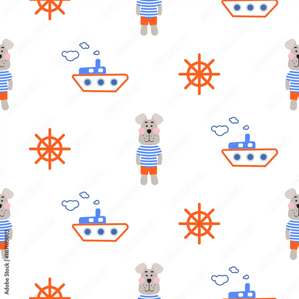 Tapety Morski chłopiec wzór z żeglarza psa bezszwowym wektorem. Śliczne dziecko w stylu tkaniny tekstylne kreskówka morskim niebieskim i pomarańczowym tle na pościel, ubrania i rzeczy dla dzieci.