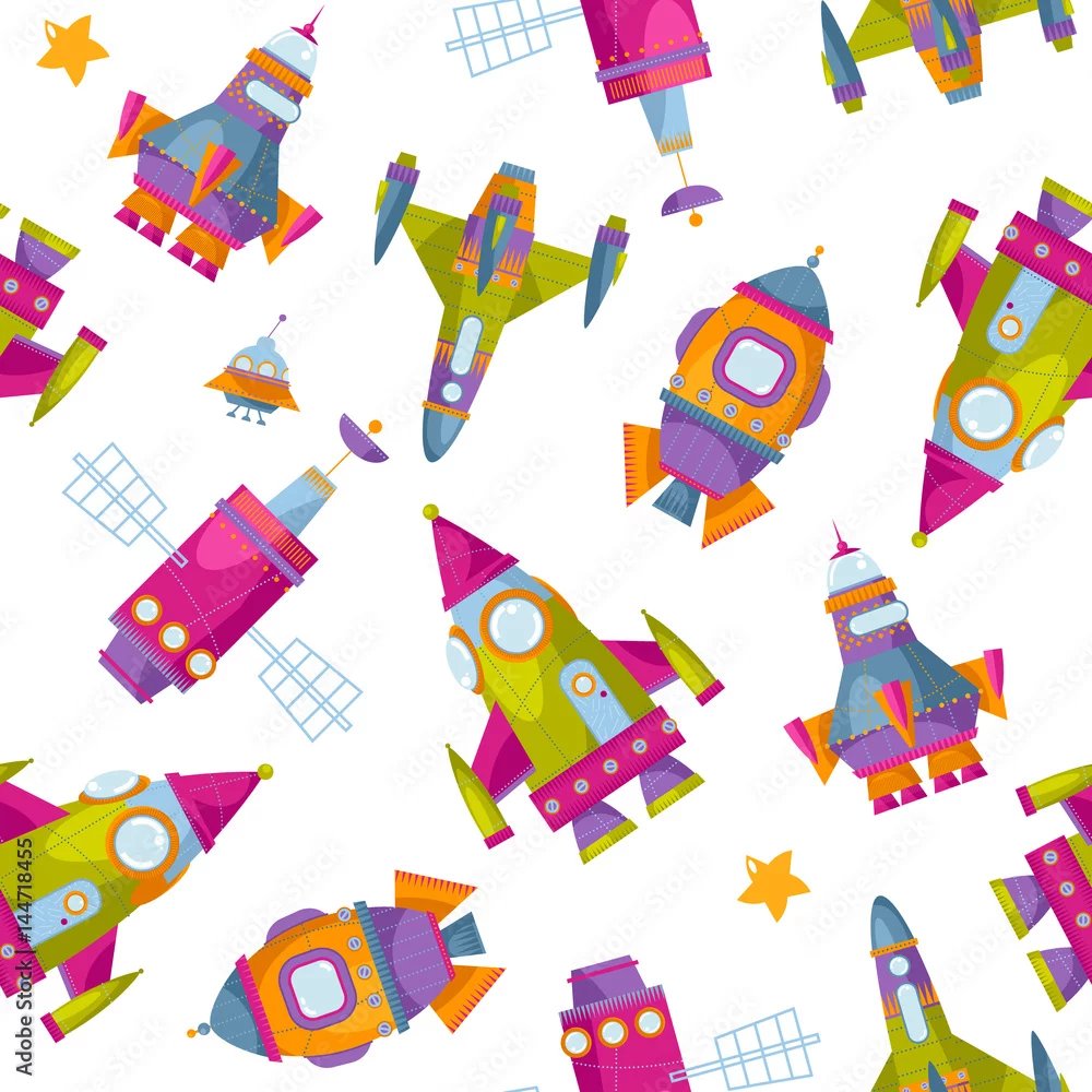 Tapety Wielokolorowe rakiety zabawkowe. Statki kosmiczne Jednolite tło wzór.