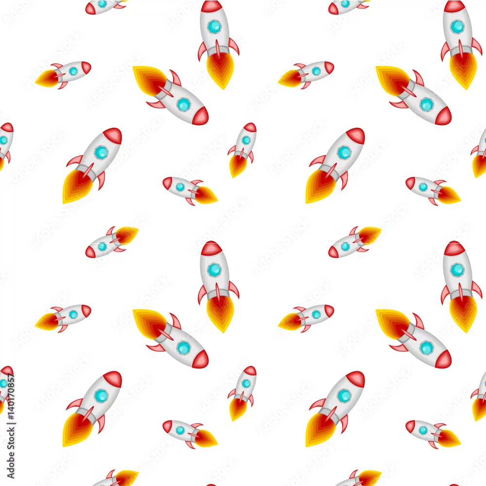Tapety Wzór. Urocze jasne rakiety na ciemnoniebieskim tle kosmosu i gwiazd. Ilustracja dla dzieci. Projekt jest idealny do drukowania na tkaninie, papierze i innych powierzchniach.