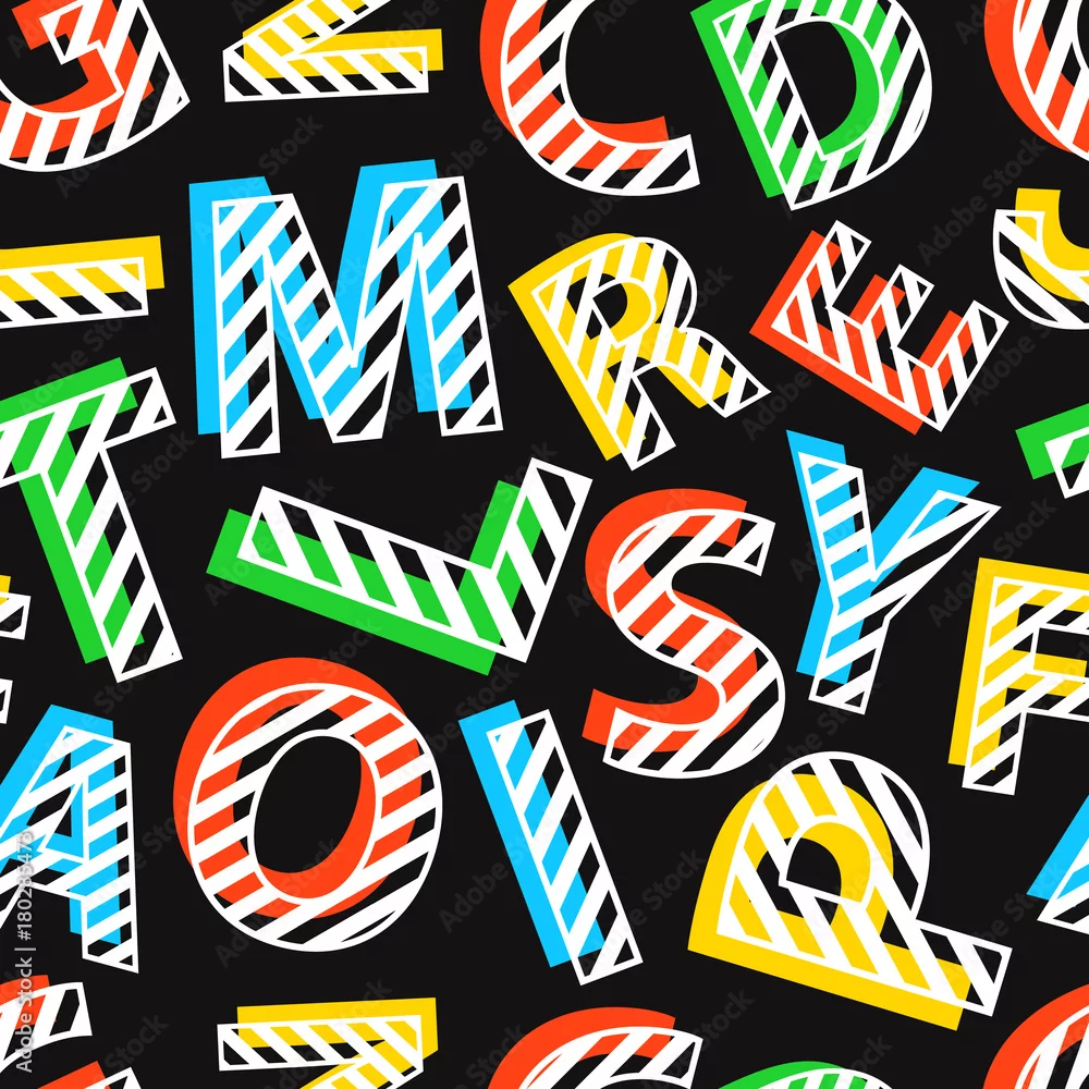 Tapety Bezszwowy wzór kolorowi listy na czarnym tle. Niemowlę, dzieci, szkolny design w białe paski. Ilustracji wektorowych. - z napisami - Picturewall.pl